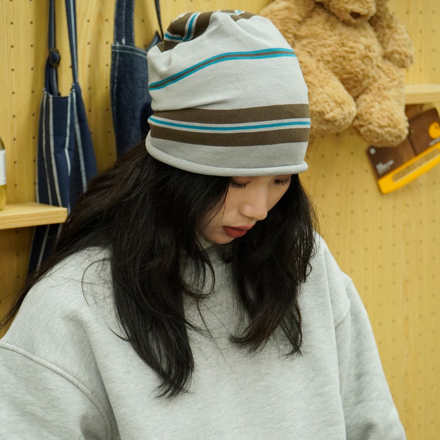 Tumulus: [THE HOBOO] ese ストライプ カーリング パイル 帽子 レディース 秋冬 流行 ブランド 防寒帽子 包頭帽子 メンズ プルオーバーハット オータム 秋物 ウィンター 冬物 Tum7263642608